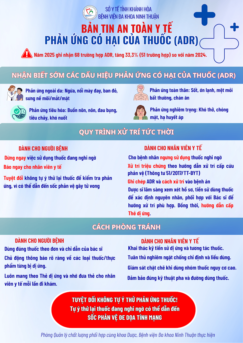 Căn cứ Quyết định số 6858/QĐ-BYT ngày 18 tháng 11 năm 2016 của Bộ Y tế về việc ban hành “Bộ tiêu chí chất lượng bệnh viện Việt Nam”. Thực hiện tiêu chí D2.3 về Thực hiện các biện pháp phòng ngừa để giảm thiểu các sự cố y khoa. Nhằm tăng cường công tác đảm bảo an toàn người bệnh, nâng cao nhận thức và trách nhiệm của nhân viên y tế trong việc phát hiện, xử trí và báo cáo phản ứng có hại của thuốc, Bệnh viện Đa khoa Ninh Thuận ban hành Bản tin An toàn y tế năm 2025 với chủ đề: Phản ứng có hại của thuốc (Adverse Drug Reactions – ADR). Bản tin tập trung cung cấp các nội dung liên quan đến việc nhận biết sớm phản ứng có hại của thuốc, nguyên tắc xử trí khi xảy ra ADR và cách phòng tránh. Đây là một trong những giải pháp góp phần nâng cao chất lượng điều trị và đảm bảo an toàn trong sử dụng thuốc tại bệnh viện. Giám đốc Bệnh viện yêu cầu các khoa/phòng/Cơ sở 2 tổ chức phổ biến nội dung Bản tin an toàn y tế đến toàn thể nhân viên y tế; đồng thời nghiêm túc thực hiện công tác theo dõi, phát hiện, xử trí và báo cáo phản ứng có hại của thuốc theo quy định.