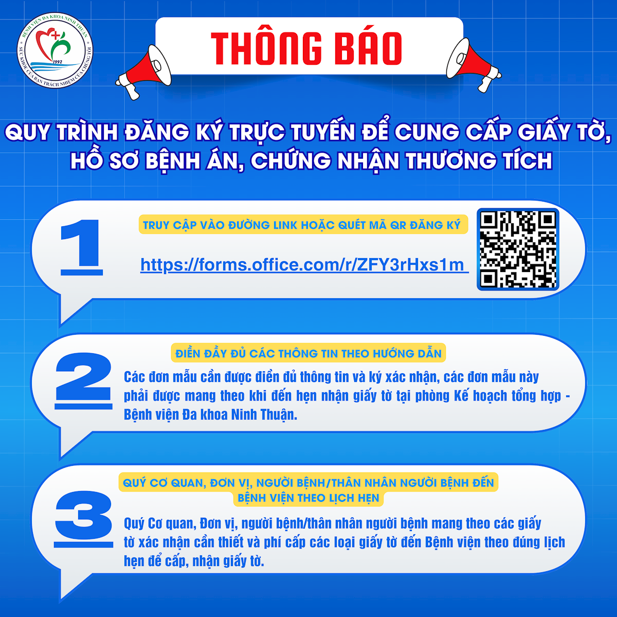 Nhằm đáp ứng nhu cầu ngày càng tăng của các cơ quan, đơn vị và người bệnh/thân nhân người bệnh trong việc cung cấp giấy tờ, hồ sơ bệnh án, giấy chứng nhận thương tích, Bệnh viện Đa khoa Ninh Thuận triển khai quy trình đăng ký trực tuyến với các bước cụ thể như sau: