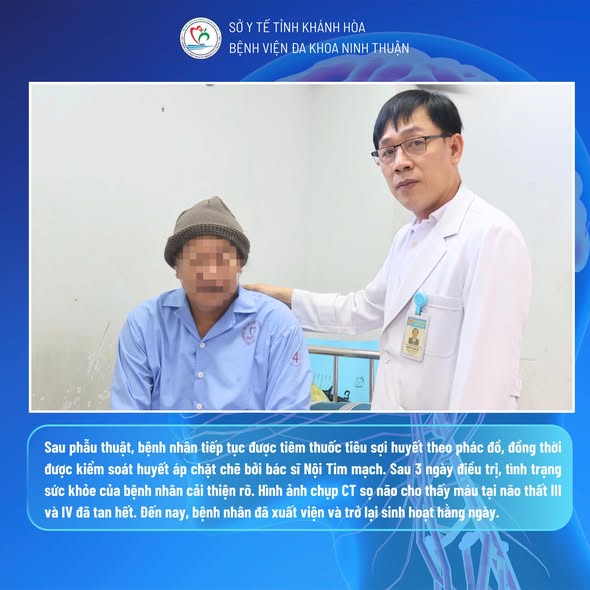 Sau phẫu thuật, bệnh nhân tiếp tục được tiêm thuốc tiêu sợi huyết theo phác đồ, đồng thời được kiểm soát huyết áp chặt chẽ bởi bác sĩ Nội Tim mạch. Sau 3 ngày điều trị, tình trạng sức khỏe của bệnh nhân cải thiện rõ. Hình ảnh chụp CT sọ não cho thấy máu tại não thất III và IV đã tan hết. Đến nay, bệnh nhân đã xuất viện và trở lại sinh hoạt hằng ngày.